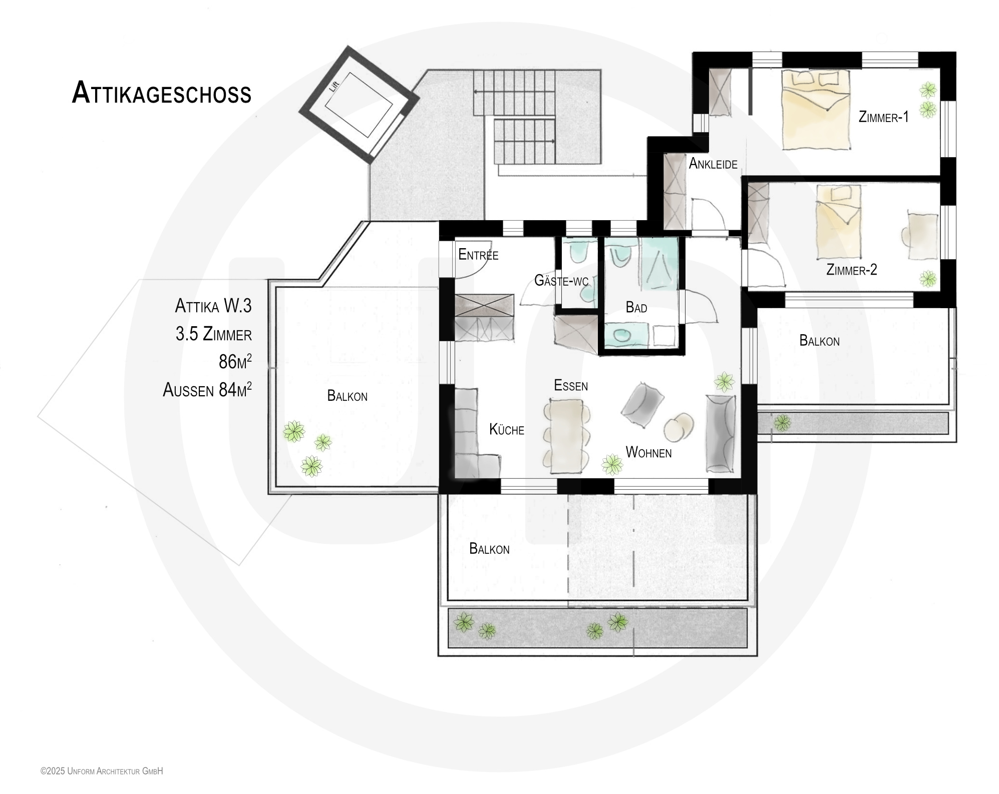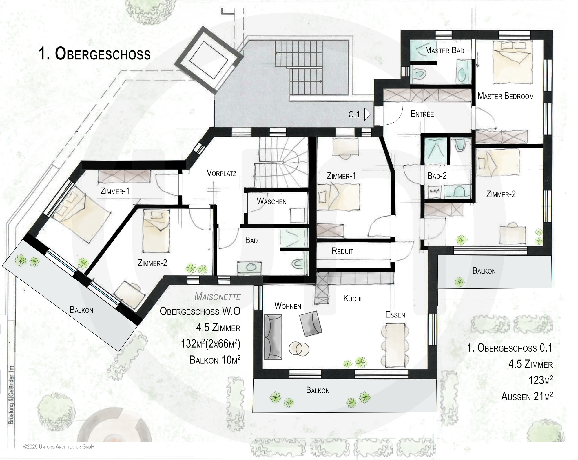Es wird ein dreiteiliges Gebäude darauf platziert mit fünf Wohnungen. Es gibt grösszügige Wohnungen, mit ein respektive zwei Wohneinheiten pro Etage und einer Attika-Wohnung.